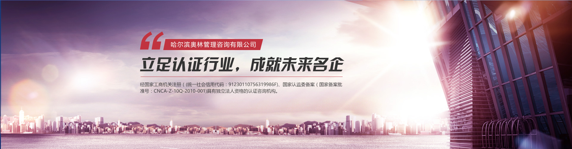 奧林公司是黑龍江省通過國家的再度資格審查,在東三省擁有自己正規(guī)辦公場所并具有國家注冊資質(zhì)(六標(biāo)咨詢資質(zhì):ISO9001/ISO14001/ISO45001/HACCP/有機(jī)認(rèn)證/TS16949,國家注冊備案時間:2010年1月19日-2014年11月18日)的認(rèn)證咨詢公司。奧林公司是咨詢業(yè)內(nèi)專家資質(zhì)全和專業(yè)范圍完整的國家注冊備案時間長的黑龍江大型咨詢機(jī)構(gòu)。奧林公司的理念是:做企業(yè)與做人一樣,追求真誠,追求永遠(yuǎn)。